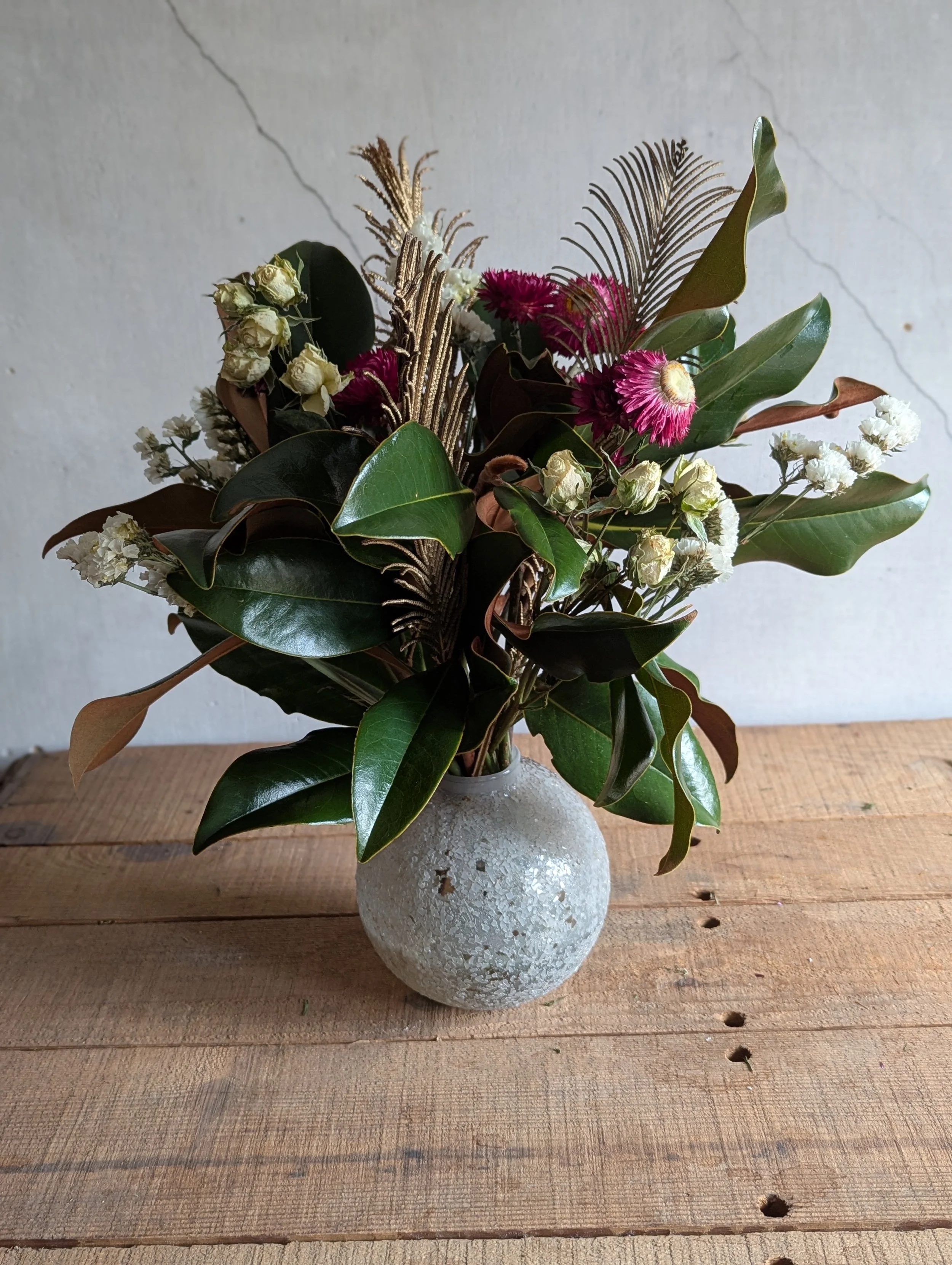 Fresh Magnolia & Cedar shine when paired with our dried (Everlasting) florals! Cranberry-Rose Strawflower, white Statice + Ammobium, cream Strawflower + gold Ferns are such a winning combo!