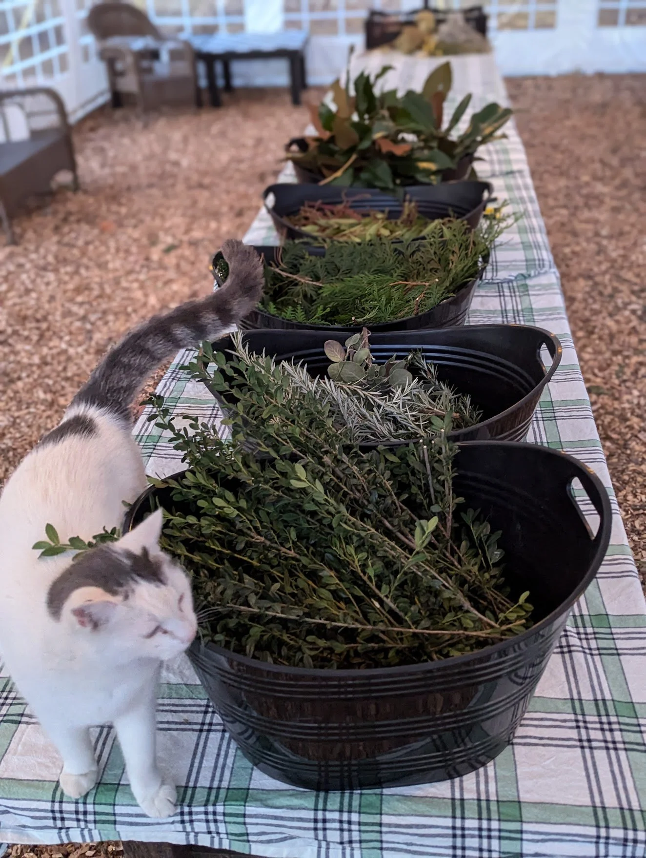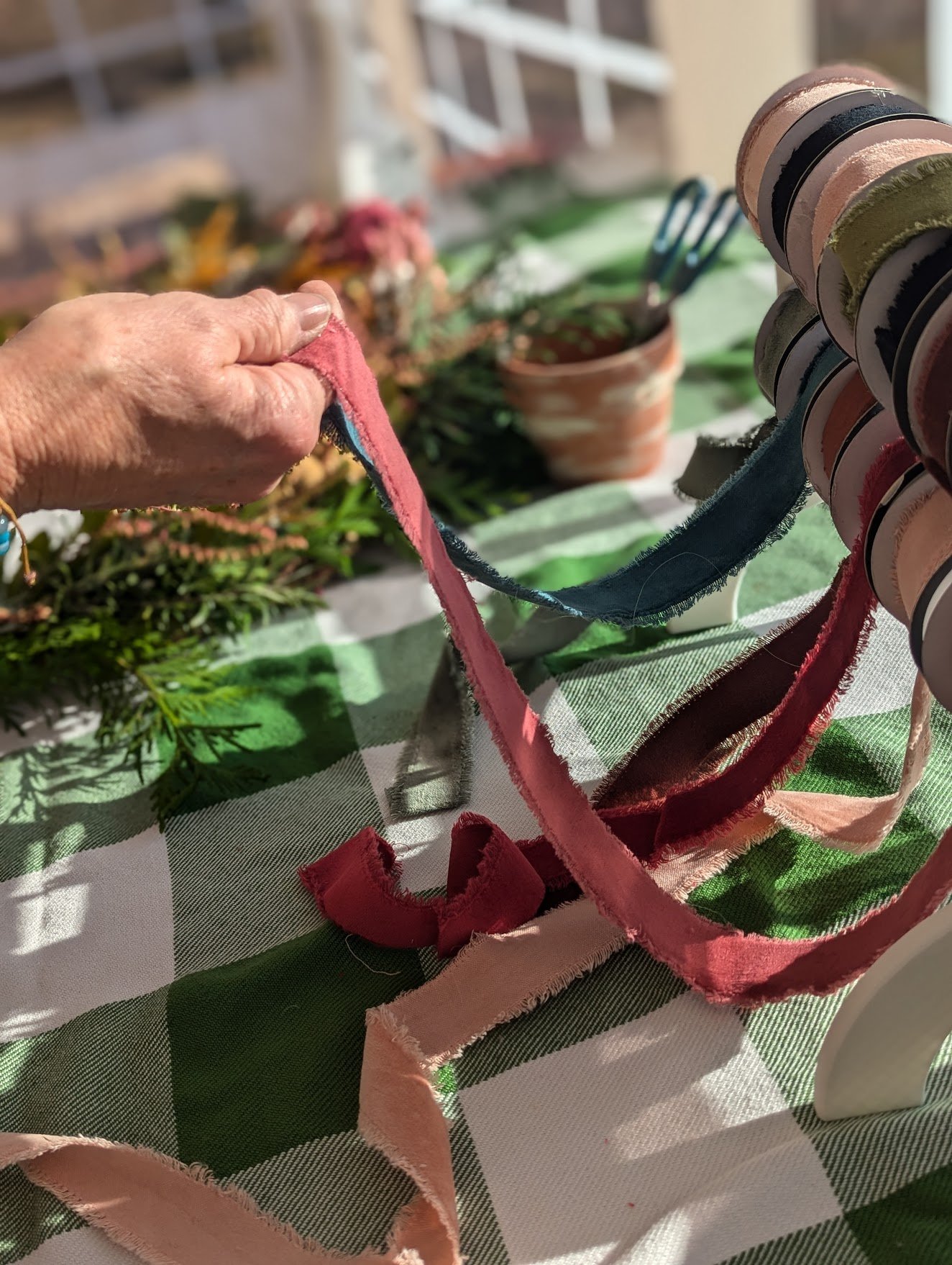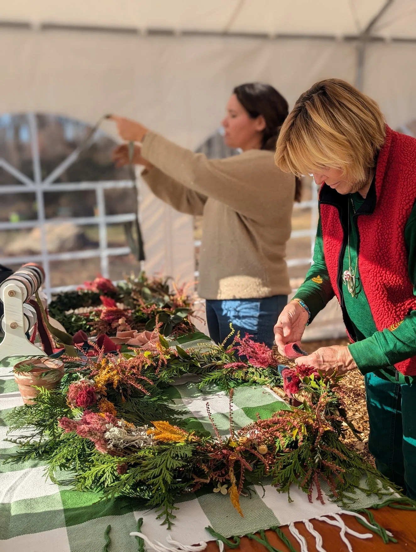 We gather around farm tables inside of our cozy, light-filled heated tent to create our wreaths. Each session lasts right around 2 hours. Wreath forms are 20” natural, grapevine forms. We have carefully selected the most beautiful, vintage-inspired velvet, frayed trim in 8 colors to choose from to add the finishing touch to your wreath!